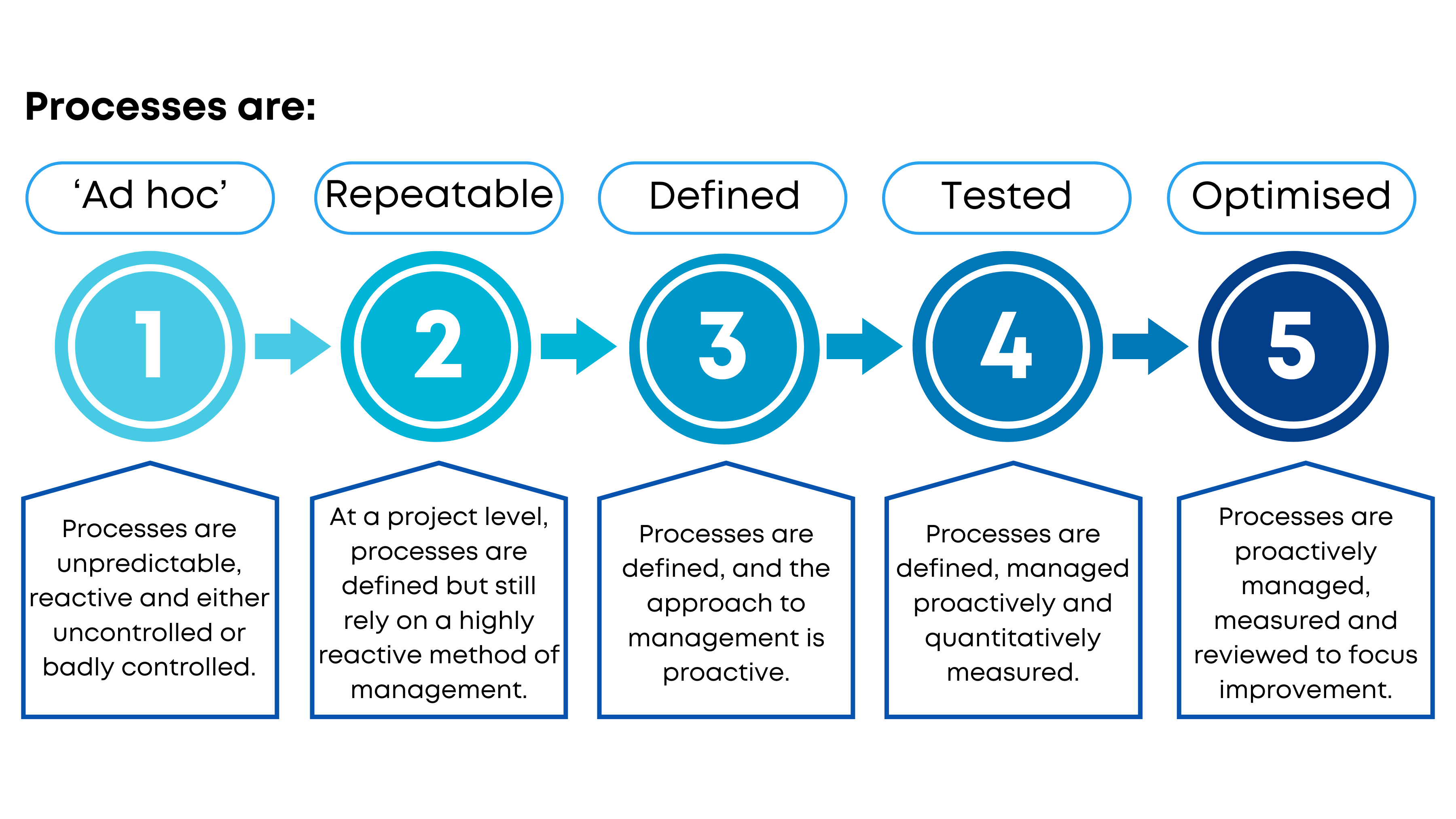 - Moving from level 1 to 2; If you have processes that work in an ‘ad-hoc’ way, the first thing to do is document them, and train people to follow them, which will make them repeatable.